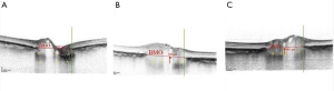 Advancements of OCT with enhanced depth imaging (EDI) allows a high-resolution visualisation of the deep optic nerve including lamina cribrosa (LC), Bruch membrane opening (BMO), as well as prelaminar tissue and laminar depth (19). Our previous observation has shown that the optic nerve head in glaucoma patients is characterized by LC thinning, in contrast with NAION eyes (22). Another study reported prelaminar tissue thickening and BMO enlargement in the acute oedematous NAION eyes compared with unaffected eyes; these changes actually reversed over time (23). EDI OCT also was employed to show detailed optic nerve head crowding in NAION, which is considered the main risk factor for the development of NAION. OCT also has changed our understanding of the possible role of the size of the scleral canal in the development of NAION. Studies using confocal scanning laser ophthalmoscopy (Heidelberg Retina Tomograph II, Heidelberg Engineering GmbH, Dossenheim, Germany) suggested that NAION eyes had smaller optic disc diameter and area as compared to control eyes (8). Subsequently, Hayreh et al. (24) hypothesized that the BMO in patients with “discs at risk” for NAION was smaller than in the general population, resulting in the characteristic optic disc crowding. However, direct comparison between clinical optic disc/fundus examination and SD-OCT imaging of the optic nerve head is inappropriate, as the information derived from each method is distinct and not comparable (25). We measured BMO area with EDI OCT in post-acute NAION and their fellow eyes and compared these measurements with normal eyes. Of note, BMO area was similar in three groups (26). Similarly, several time-domain OCT studies also have shown that BMO is not smaller in patients with NAION than in age-matched controls (6,27). Another EDI OCT study also determined that BMO area in NAION and control subjects was not significantly different (28). We also measured prelaminar tissue (perpendicular distance between the internal limiting membrane (ILM) surface and anterior laminar surface) in post-acute NAION eyes. We found prelaminar tissue thickening in both NAION eyes and unaffected fellow eyes of NAION patients, as compared to eyes in normal control subjects. Given that we identified thickened prelaminar structures in both the affected and unaffected eyes of patients with NAION (Figure 2), we suggest that this change might be pathogenic and not a consequence of the disease (26). Another study also found thicker (but not significant) prelaminar tissue in NAION fellow eyes compared to controls (29). Further and even more importantly, though, EDI OCT allowed us to measure peripapillary choroidal thickness. Our group has found a thicker peripapillary choroidal structure in both the affected and unaffected fellow eyes of NAION subjects when compared to control subject eyes (30). Studies by Pérez-Sarriegui et al. (31), and Nagia et al. (28) confirmed our results in finding a bilaterally thicker choroid in patients with NAION. It seems that apparent thick prelaminar neural tissues have been pushed anteriorly by a thickened peripapillary choroid, and both features contribute to the appearance of a “crowded” disc in NAION.